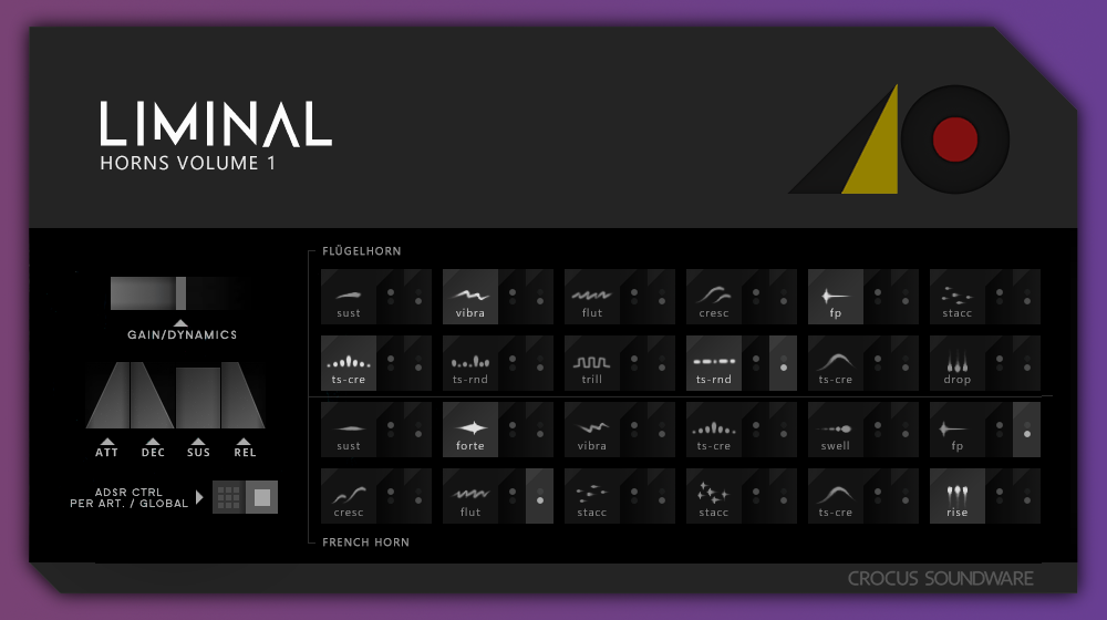 Sample banks can be triggered via both the UI and keyswitching. There is also a so-called 'dynamics' knob which controls the entire instrument's gain independent of the instrument-level volume control. Finally, there is functionality to control ADSR at the instrument level, which can be optionally switched to the traditional articulation-level ADSR control.